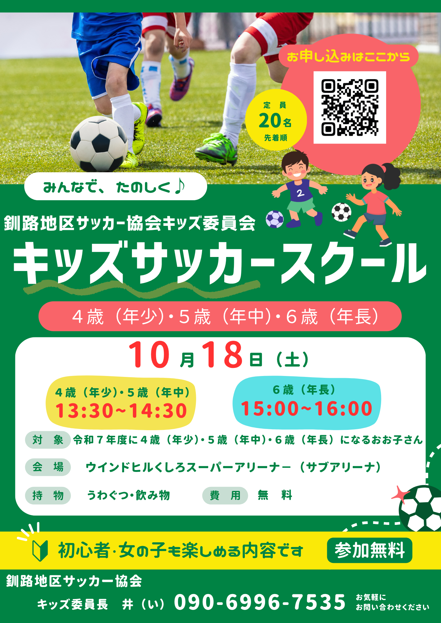 令和7年度に4歳・5歳・6歳になるお子さんを対象としたサッカースクールを開催します。 遊び感覚でサッカーに慣れ親しんでもらうスクールですので、お子さんの初めてのサッカー体験におすすめです。